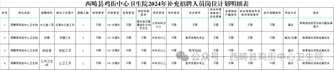 为满足我院发展的需求,加强人才队伍建设,改善人才队伍结构,切实缓解当前科室发展、人员紧缺问题,经院领导研究决定,面向社会公开招聘编制外人员5名,现将有关事项公告如下:本次公开招聘坚持德才兼备的原则,坚持公开、平等、竞争、择优的原则。(一)拥护中国共产党的领导,热爱社会主义;遵纪守法,品行端正,具有良好的职业道德和全心全意为人民服务的思想。(二)具有全面履行招聘岗位职责的专业知识和岗位能力,符合国家对执业资格的要求。(四)受党纪、政纪处分期限未满或正在接受纪律审查的人员,以及受刑事处罚期限未满或者正在接受司法调查尚未做出结论的人员,不得应聘。1.拥护中国共产党的领导,坚持党的路线、方针、政策,遵纪守法,品行端正;2.具有良好的职业道德和全心全意为人民服务的精神,热爱本职工作;3.身体健康,具有与岗位匹配的身体素质、专业技能和工作能力。(二)岗位设置:办公室岗位1人,护理岗2人,检验岗1人,公共卫生科岗位1人,相关要求详见附件1人员招聘岗位计划明细表。1.曾因犯罪受过刑事处罚或受过劳动教养的人员,被司法机关确定为犯罪嫌疑人或有其他严重违法行为的;2.具有伪造有关证件、证明材料或有其他弄虚作假行为的;6.在事业单位公开招聘中被认定有舞弊等严重违反聘用纪律行为的人员;(二)报名时间: 2024年2月6日至2月19日。08:00-11:30,14:30-17:30 。(二)报名地点:西畴县鸡街中心卫生院办公室(办公楼三楼)。(四)报名需提供资料:报名表、身份证、毕业证(含中专、高中/职高及全日制大学毕业证)、学位证、相关资格证,近期免冠照一寸。网上报名请把相关资料扫描发至邮箱:1622358903@qq.com ,线下报名请提供相关资料原件。1、面试时间:2024年2月20日,星期二早上9:00(如有更改将以电话形式通知,请保持电话通畅)。体检标准参照《公务员录用体检通用标准(试行)》执行,体检合格后方可聘用。拟录用人员在西畴县鸡街中心卫生院公众号进行公示,公示时间为3天,公示无异议的,即被确认为本次聘用人选。试用期3个月,考核合格与单位签订劳动合同,按《西畴县鸡街中心卫生院编外人员管理办法》执行。(一)在招聘过程中,如发现报名者填报情况不实,不符合招聘条件者,取消其招聘资格。(二)本启事由西畴县鸡街中心卫生院办公室负责解释。(三)凡在规定时间内未按要求进行信息确认,未参加考试、体检的,均视为自动放弃本次招聘。(四)为稳定西畴县医共体人才队伍,本次招聘仅限西畴县医共体外人员报考。